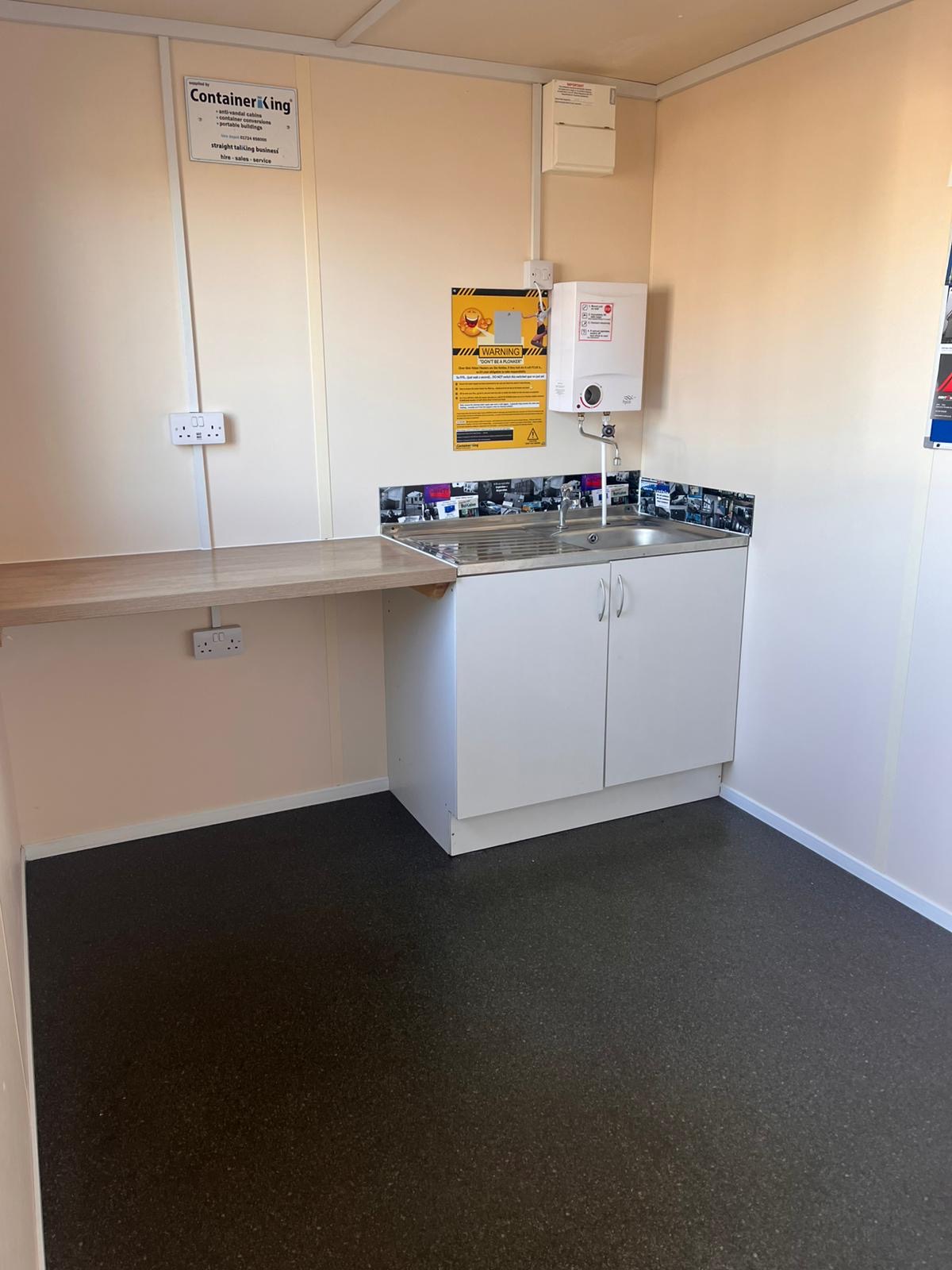 Fully fitted 20ft x 8ft ISO Shipping container converted into a 50/50 steel anti-vandal canteen/store unit which is sprayed in Moorland Green. This unit is split 50/50 half being a standard shipping container storage area with standard double opening doors, the bulkhead has a light and double socket and double doors hasa security hasp fitted. The other half of this unit being a fully lined canteen with electrics, with externally 1no Kirncroft steel window shutter fitted along with aluminium double glazed sliding window and a standard 910mm insulated Kirncroft multi-locking entrance door. This unit like all standard ISO shipping container’s has a 1.6mm Corton Steel Shell, with fork pockets. Inside the flooring is heavy duty welded vinyl, walls are boarded in a 9mm hardwood ply lining and overboard in vinyl faced creme plasterboard and ceiling white linen vinyl faced plasterboard. This unit has been fitted with full electrics LED Lighting, generous allowance of double sockets, This conveniently versatile unit is great for that project where canteen space is required also with additional separate space for tool or material storage. This unit is in excellent condition and available to buy or hire.