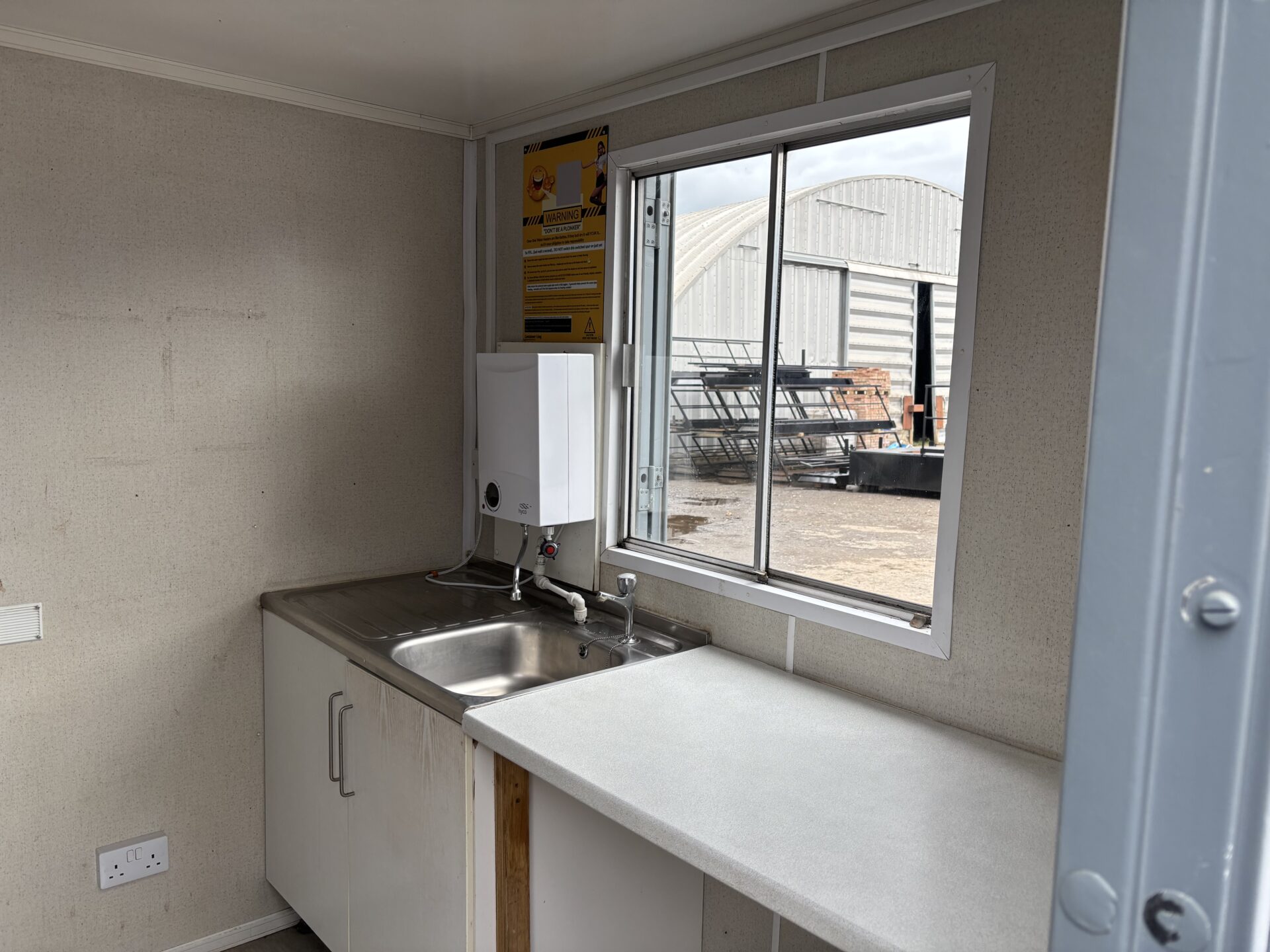 20ft x 8ft Steel jack leg anti-vandal site cabin canteen / office in good condition. This unit has an end elevation door and two steel shuttered window, one in the end elevation and one to the left hand side of entrance door.