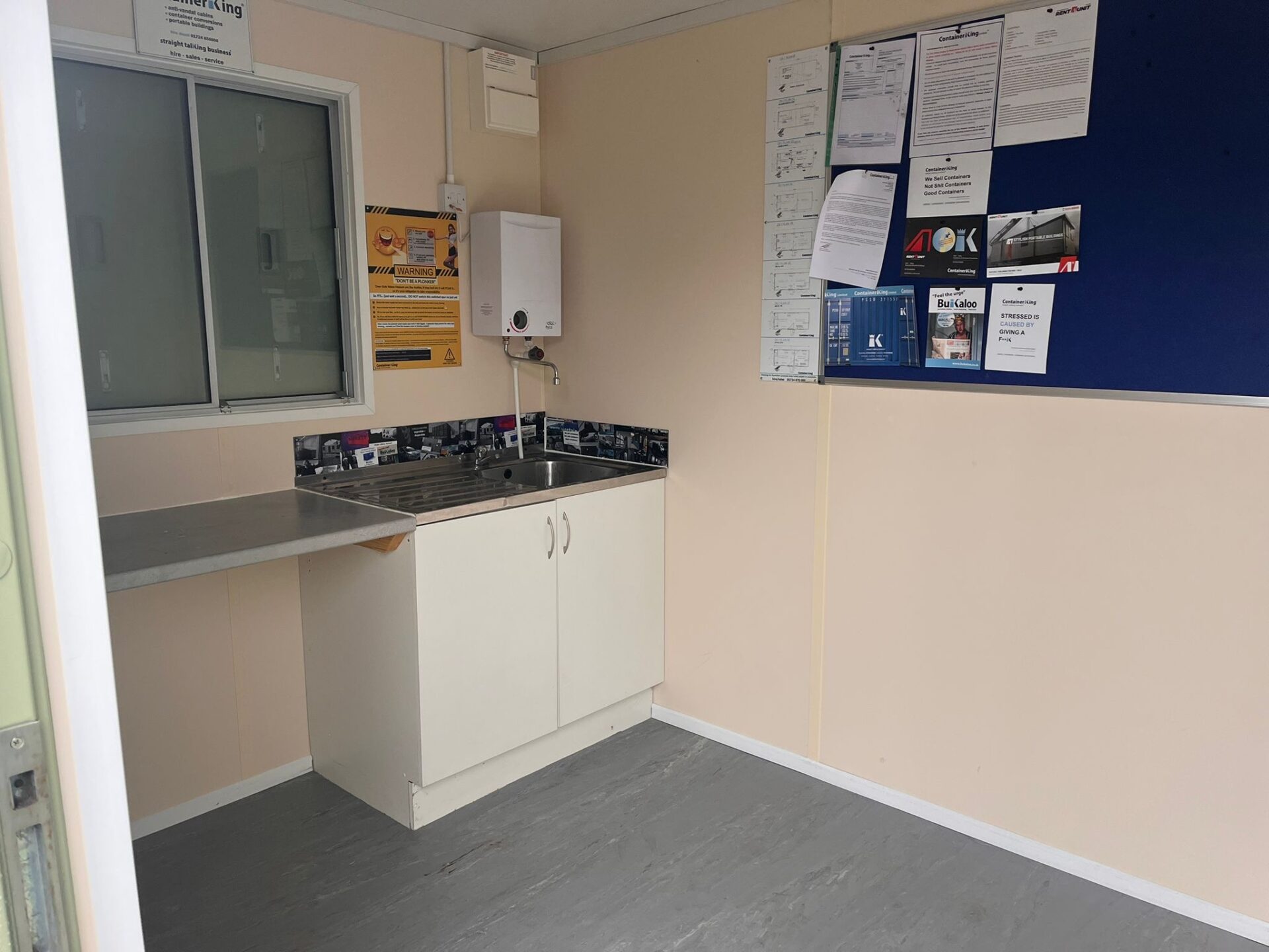 Full Description : The Canteen area is accessed via a multi-locking Kirncroft 915mm standard steel entrance door and has the benefit of being fully lined (9mm Hardwood ply” and insulated “100mm loft roll 44”, there is a double glazed aluminium sliding window fitted which has the added benefit of the protection of insulated steel shutters. There are ample double sockets located around the walls and the floor is covered with a welded heavy duty vinyl. This unit is heated via a wall hung electric panel heater, there is a sink and base unit fitted with over-sink hot water heater and 600mm worktop providing a handy kitchenette area with ample sockets for microwave and kettle.