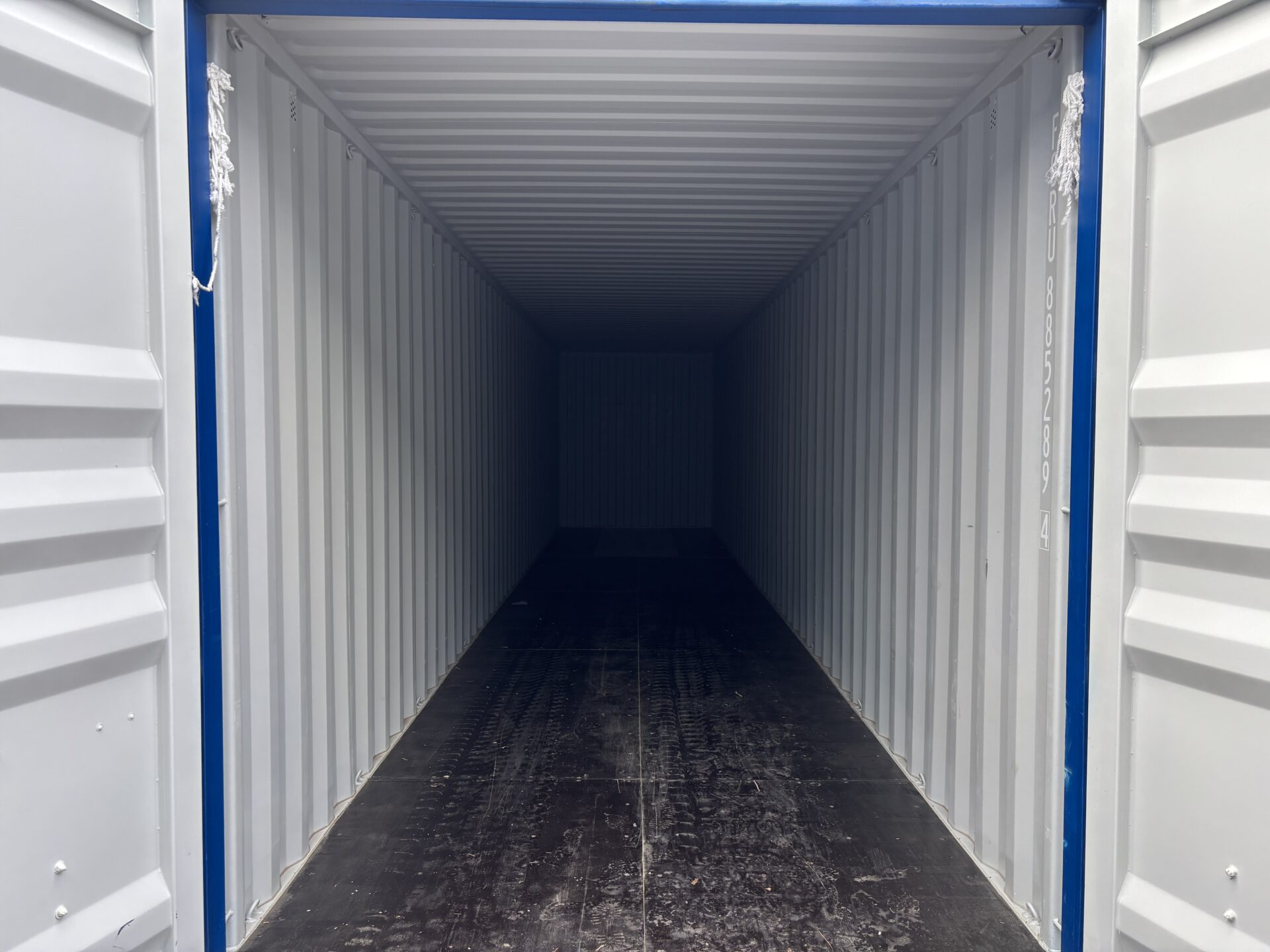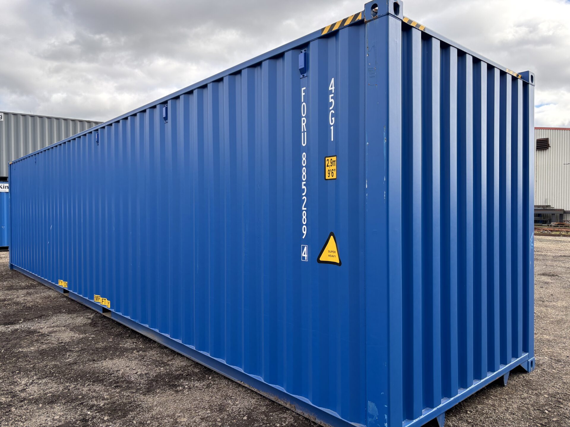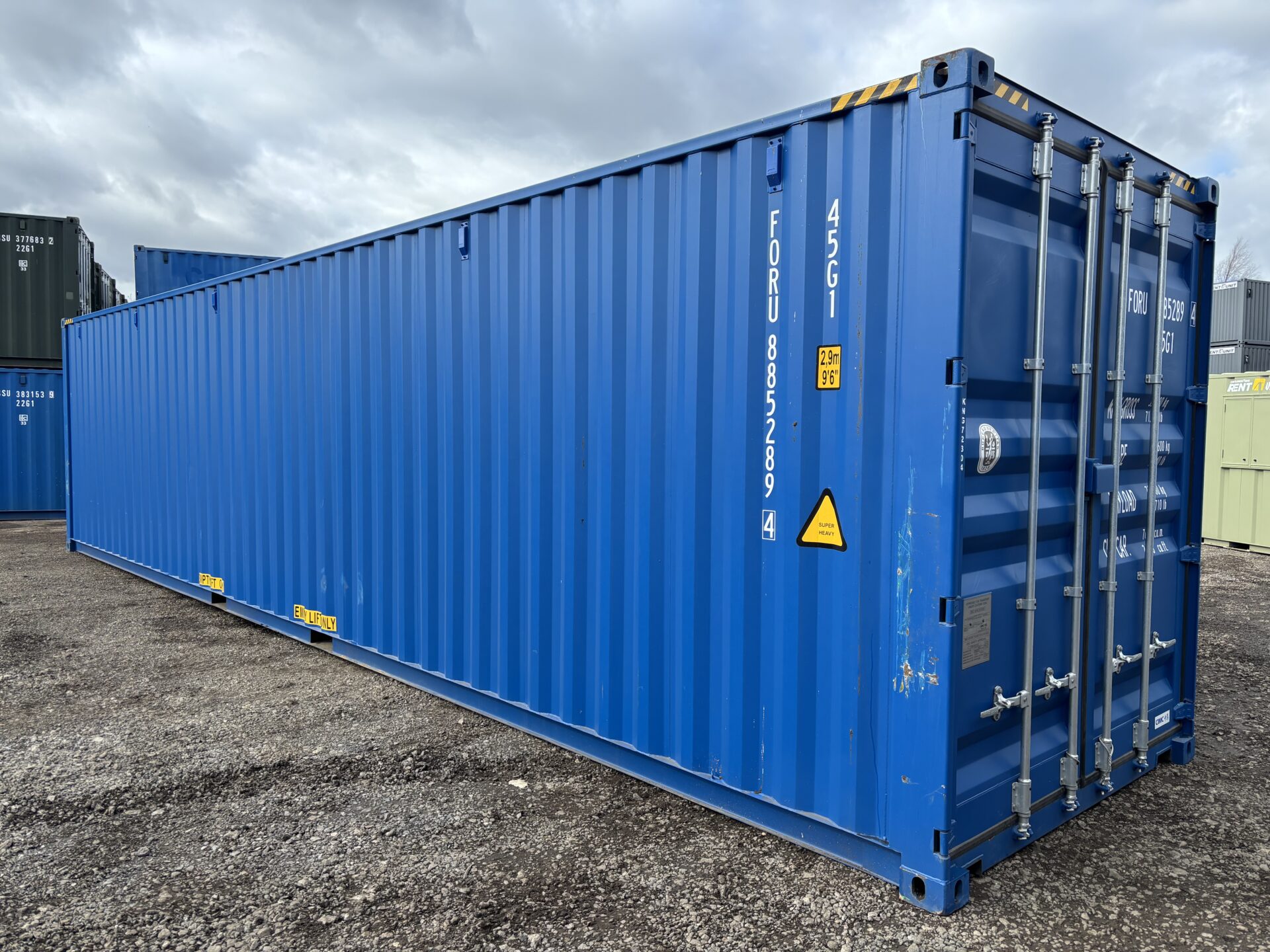 ContainerKing® / rent-a-unit proudly offers this 40ft High Cube One Trip Shipping Container for sale, finished in RAL 5010 Gentian Blue and manufactured from corrosion-resistant Corten steel to full ISO container standards.