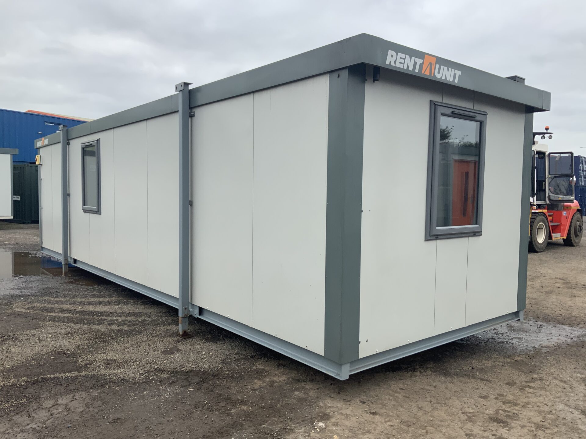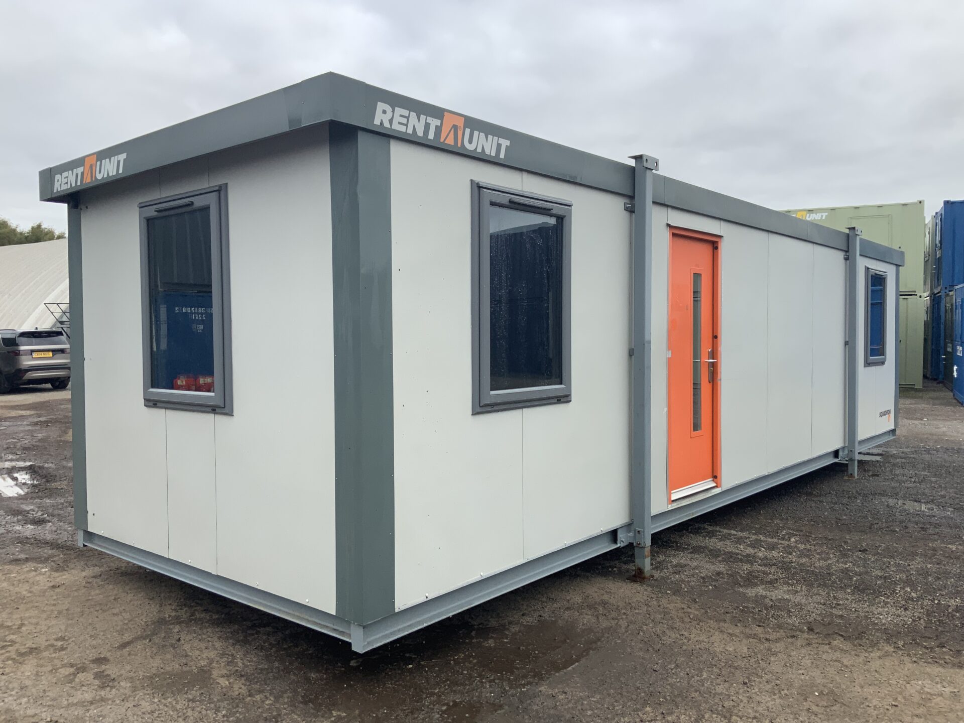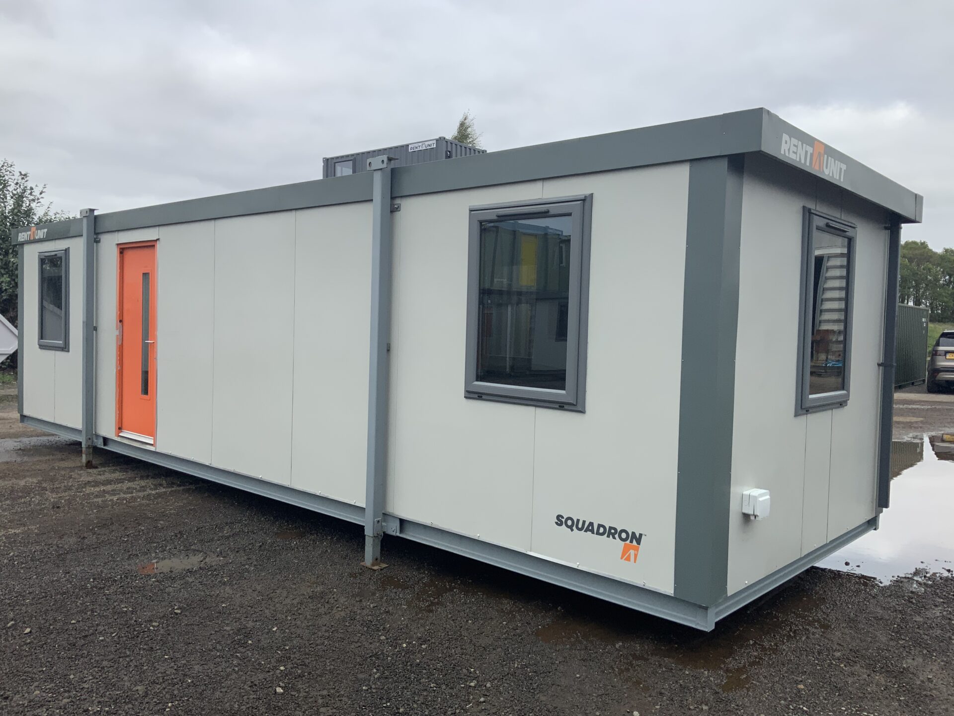 This 32ft x 10ft Squadron® jack leg office cabin (RAU0005) offers a clean, modern workspace finished in Goosewing Grey with Burnt Orange accents.