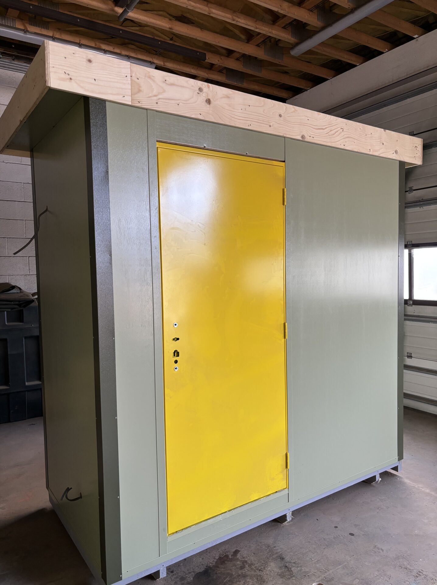 timber framed plastisol cladded fully relocatable 8ft x 4ft storage box for both internal and external use. This building can easily be moved around a factory or manufacturing facility and used for tool storage or for a cleaning storage cupboard ETC. Secured with a key lockable kirncroft multi locking insulated steel door, it has a 600mm deep bench to one end and 2 bays of 800mm wide x 300mm deep 5 tier shelving fitted, two double sockets internally and an external double socket, microwave sensor light and sfs flex outlet power point for tube heater. 50mm galvanised cable management tray secures the mains power cable, fitted with a 32a appliance inlet socket to 4 way fusebox consumer unit. plastisol is 12b21 moorland green with contrasting 12b27 chive green trims and fascia.