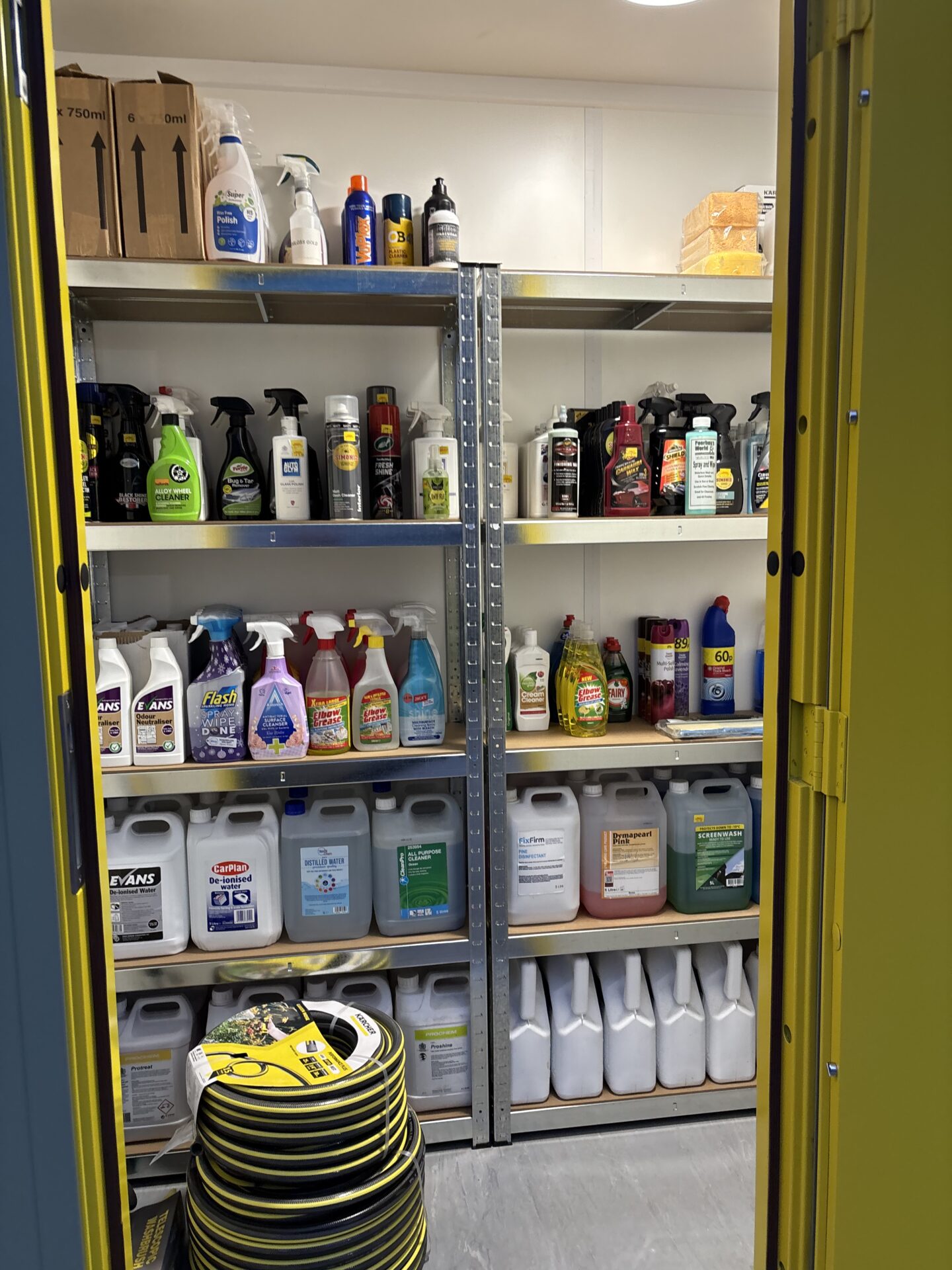 A durable storage cupboard designed to house general cleaning products and equipment. Designed to be fully moveable with a small fork lift to anywhere within a factory premises where required.